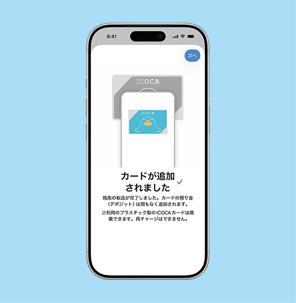 端末への取り込みが完了したICOCAはカードに戻すことはできません。取り込み元のICOCAカードは使用できなくなるため、お客様にて破棄してください。