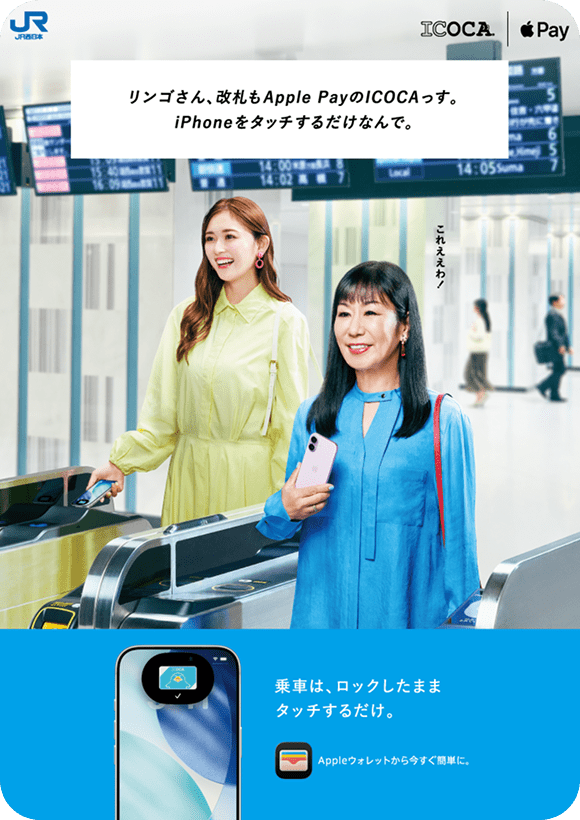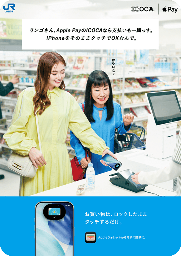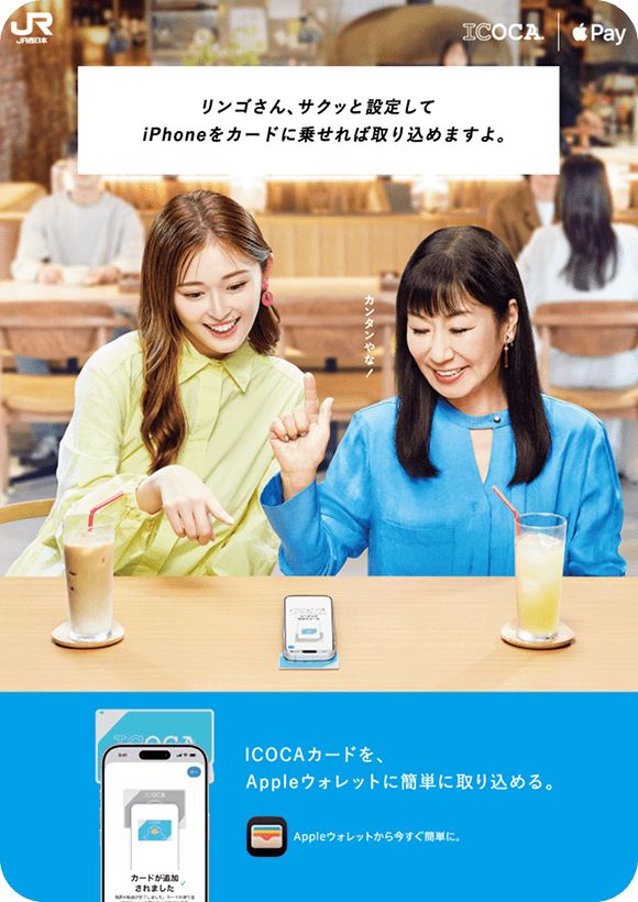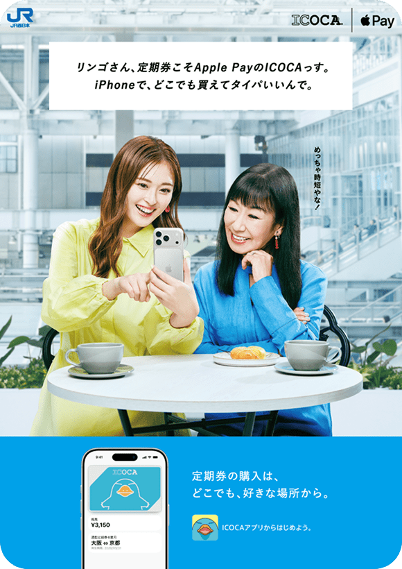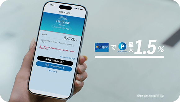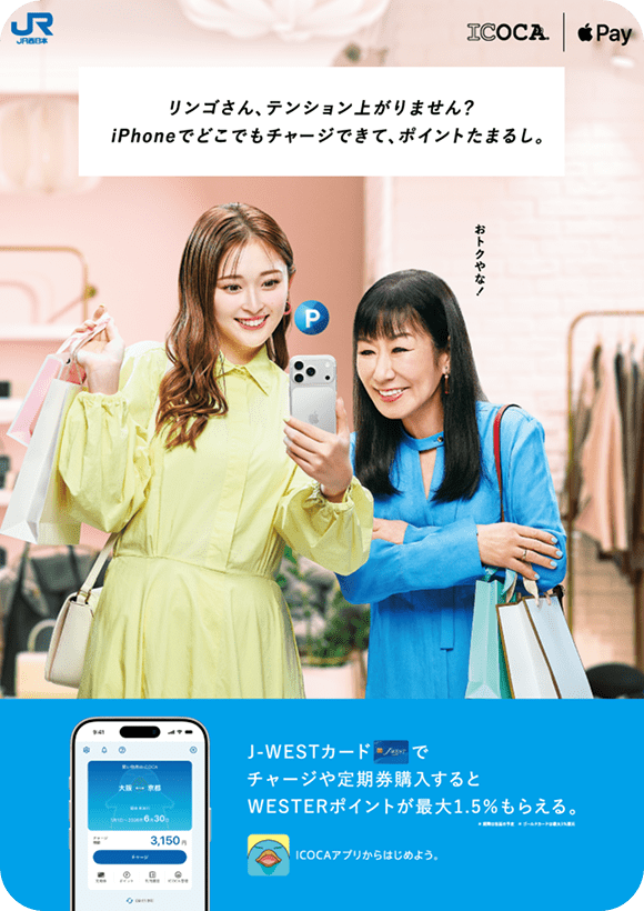 Apple PayのICOCAではチャージや定期券購入の決済手段として、Apple PayまたはICOCAアプリに登録したJ-WESTカードをご選択いただけます。