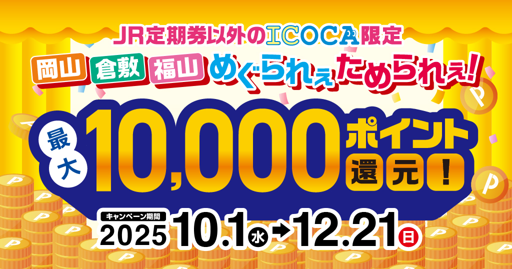\JR定期券以外のICOCA限定!/ 岡山駅・倉敷駅・福山駅までのJR利用や、対象店舗でのお買い物やGPSチェックインなどで、最大10,000ポイントのWESTERポイントを還元!ICOCA1枚で移動もお買い物も。WESTERアプリからエントリーして、でーれーおトクにポイントためられぇ!