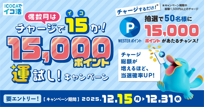 - ※3 電車・バスを除く全てのお買い物でたまります。当キャンペーンで進呈するポイントの種類はWESTERポイント(チャージ専用)です。