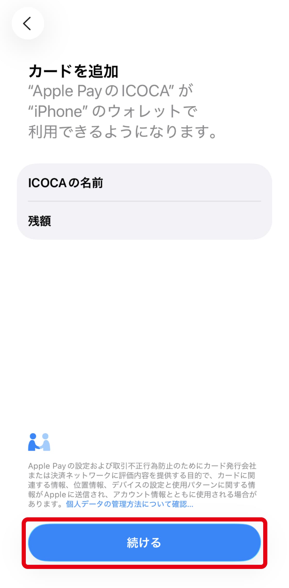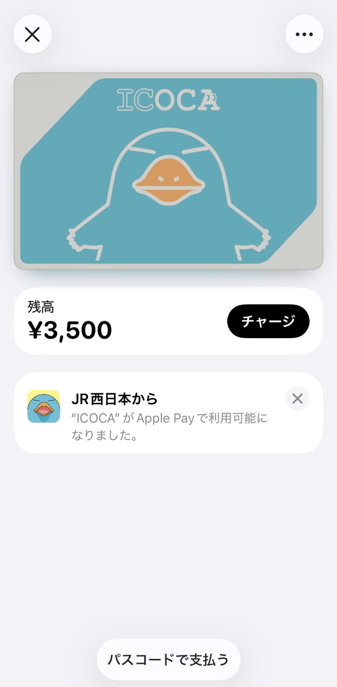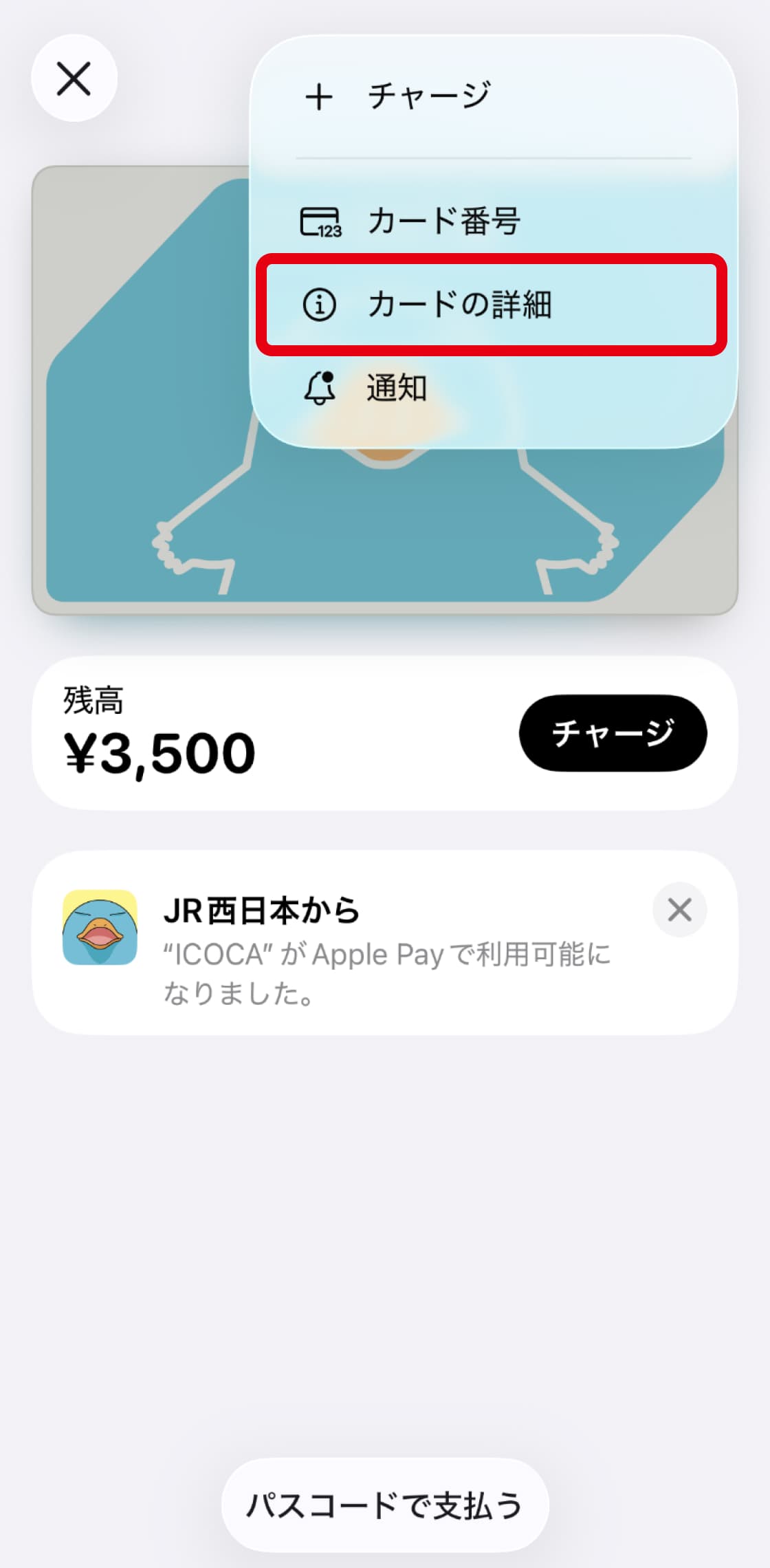 - チャージ残額とデポジット(500円)がApple PayのICOCA残額に反映されていること