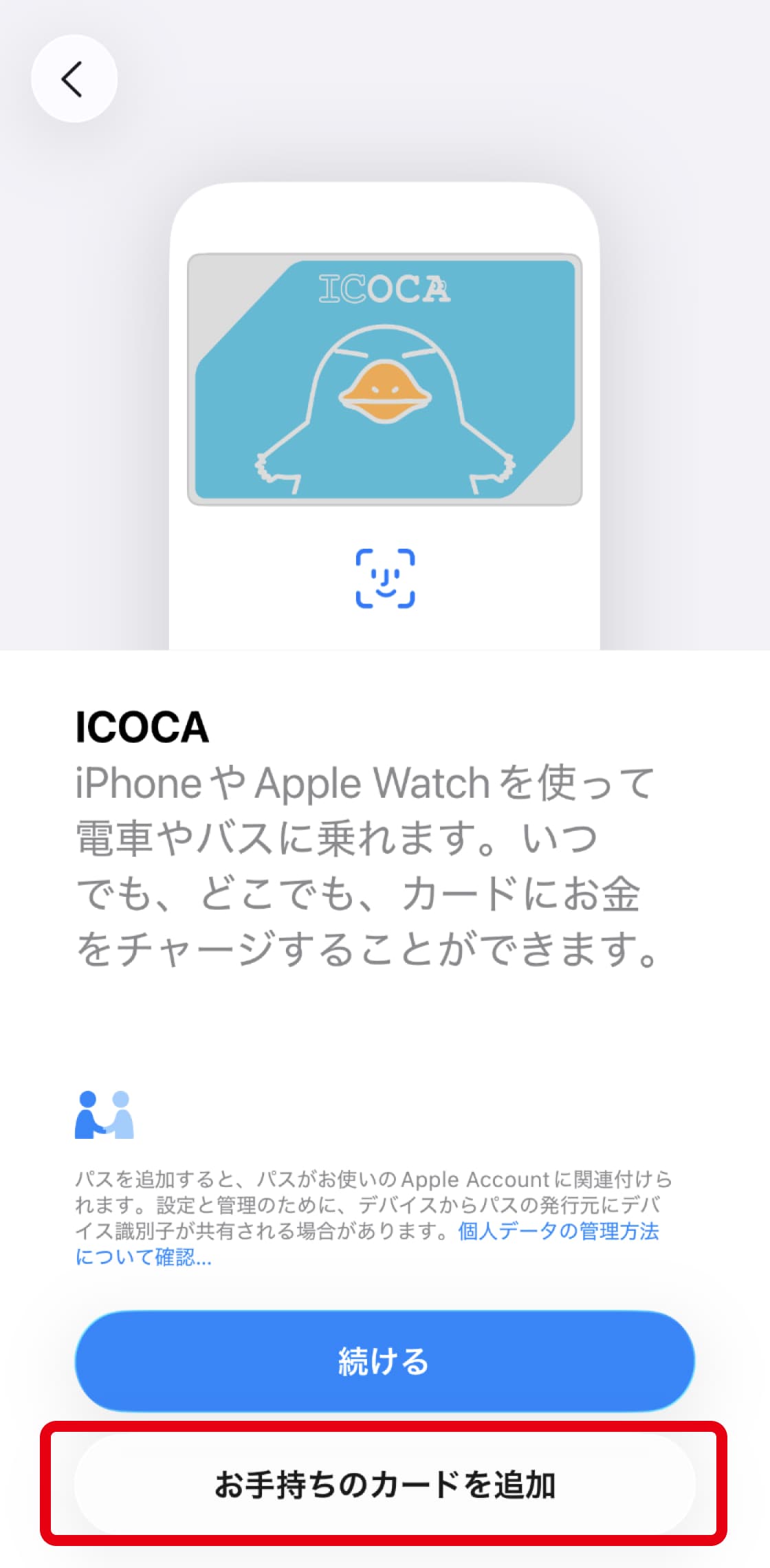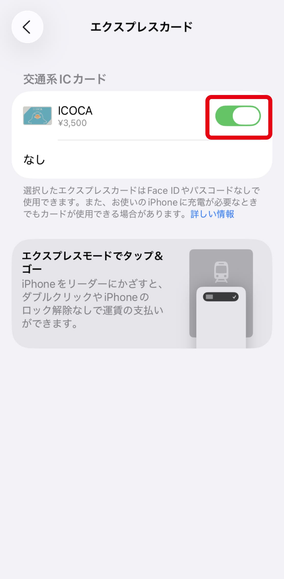 交通系ICカードとして、初めてICOCAをApple Payに追加するとアプリを開かず、Face IDなど無しで利用できる「エクスプレスカード」として自動的に設定されます。機能や設定手順など詳しくはこちらをご確認ください。