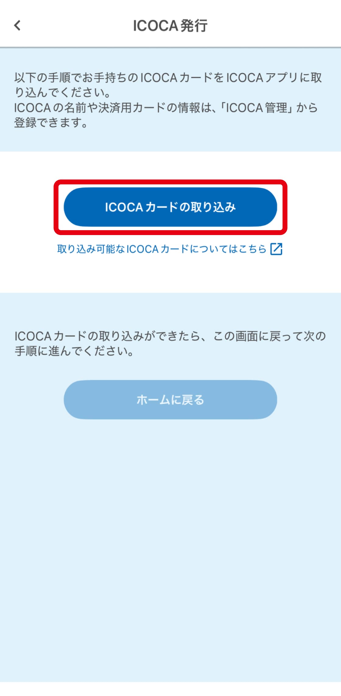 - 取り込み後のSMART ICOCAはご利用できなくなりますので、ご自身で破棄してください。また、元のSMART ICOCAに戻すことはできません。