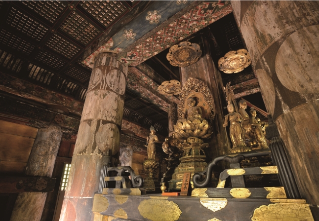 世界遺産に登録された真言宗総本山で、正式名称は「教王護国寺」。平安京造営時に創建され、のちに弘法大師空海に下賜された。江戸時代再建の五重塔(国宝)は、高さ約55mで木造の古塔としては日本一高い。特別公開の初層内部は極彩色の文様で彩られ、大日如来に見立てた心柱を囲んで金剛界四仏が安置されている。また薬師三尊像を祀る金堂(国宝)、21体の仏像が立体曼荼羅を形成する講堂(重文)も拝観できる。