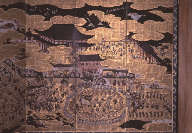豊臣秀吉の菩提を弔うため北政所ねねが建立した寺。伝小堀遠州作の庭園(史跡・名勝)や、「霊屋」(重文)の華麗な装飾「高台寺蒔絵」など、桃山文化を伝える建築や寺宝が数多く残る。2026年夏頃、237年ぶりに客殿(小方丈)が悲願の再建となるが、「京の冬の旅」期間中、この客殿の襖絵を本堂にて先行公開。再建にあたり日本画家・志村正画伯が描いた「春の草花図(牡丹)」など、絢爛豪華な桃山絵画を思わせる金箔襖である。秀吉愛用の「鳥獣文様陣羽織」(複製)など特別展示も行われる。