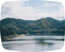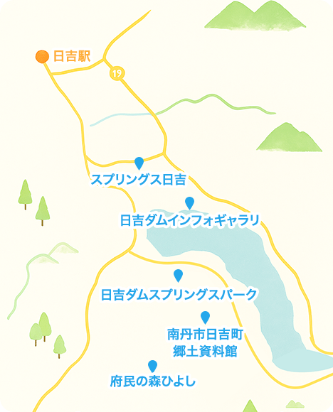 日吉町の象徴ともいえる巨大なダム。展望台からは湖と山並みが一望でき、四季によってまったく違う表情を見せます。