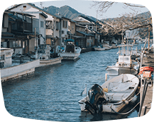 「東洋のベネチア」と呼ばれる風情ある漁師町で、運河沿いに家屋と漁船が並ぶ景色が特徴です。