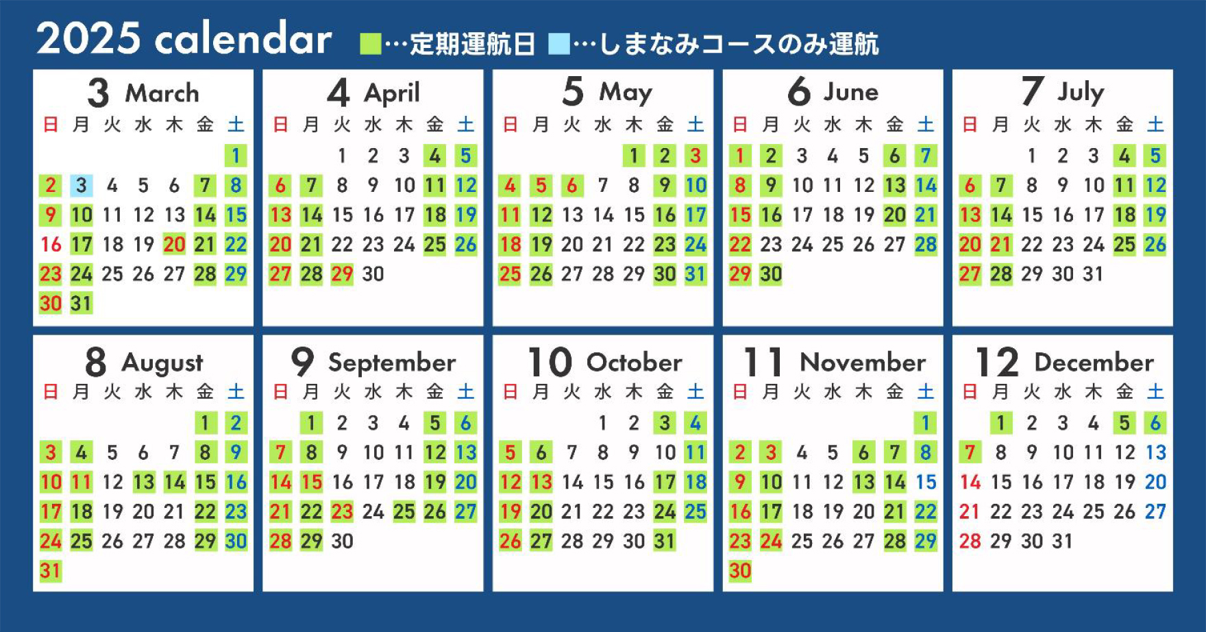 2025年3月1日(土)~2025年12月7日(日):月曜日・金曜日・土曜日・日曜日・祝日に運航
