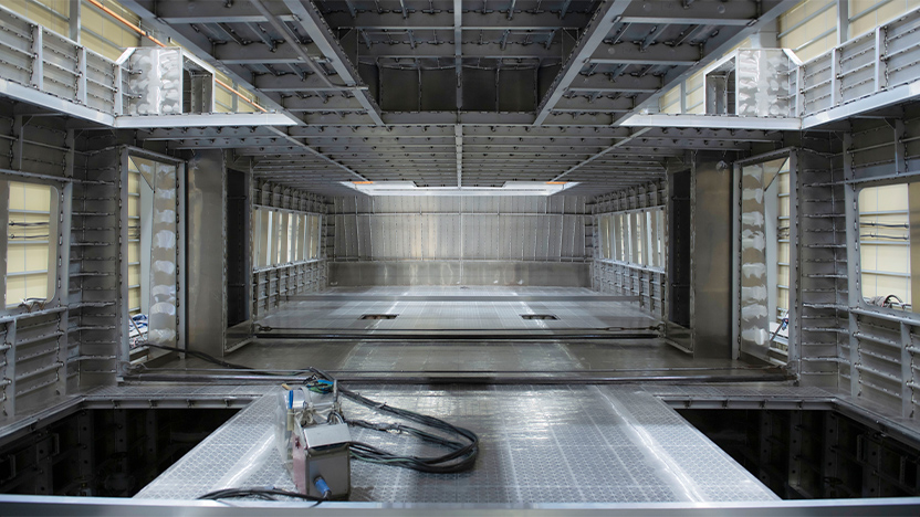 特別に、客室となる上部構造の内側に入らせていただきました。内部は広々としていて、壁や天井はまだ補強構造が見えています。一面キラキラした銀色の世界で、とても美しい!