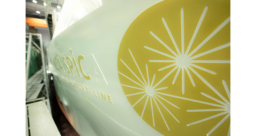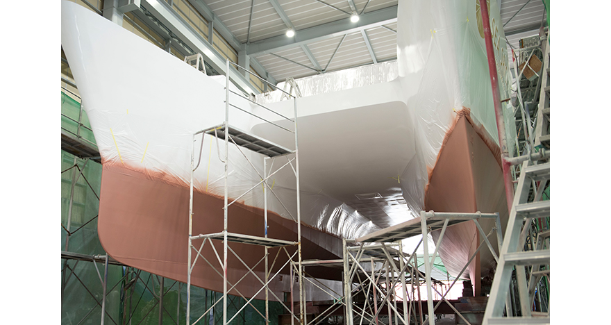 「SEA SPICA」の建造が進められている造船所『瀬戸内クラフト株式会社』のヤードを訪れると、足場がかけられた「SEA SPICA」は塗装工程の真っ最中。銀色だった大きな船体は白と赤のツートーンカラーになり、そして船首には円に三つ星が象られたエンブレムが金色に輝いています。