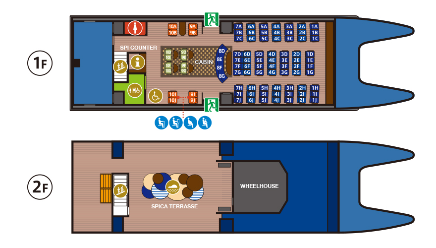 The upper-deck “SPICA TERRASSE” features sofas crafted in the image of the Setouchi island chain, along with counter-style tables. These appointments ensure optimum and unobstructed views of the exhilarating Seto Inland Sea scenery. The barrier-free design includes an elevator for ready access from the lower level for mobility challenged passengers.