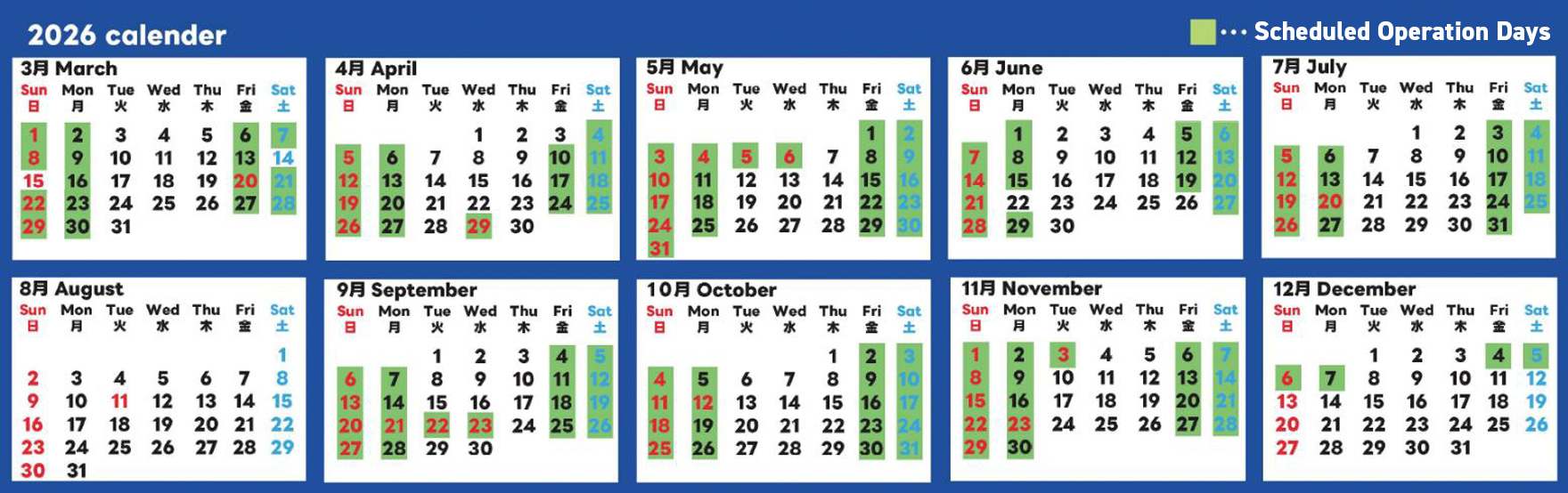 March 1, 2026 (Sunday) to December 7, 2026 (Monday): Operates on Monday, Friday, Saturday, Sunday, and National Holidays