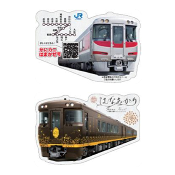 ご乗車のお客様に「はなあかり」車両と「はまかぜ」車両を表裏にデザインした列車型カードを、お渡しします。