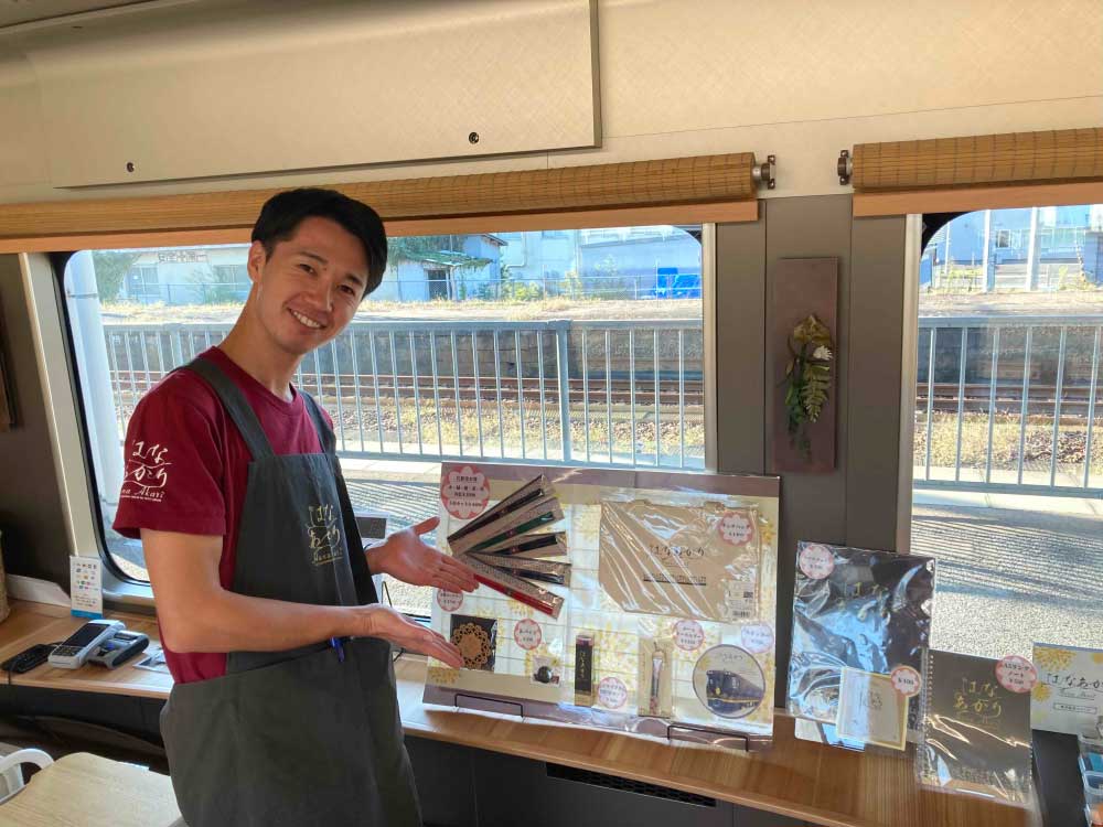 アテンダント2名が乗車し、2号車サロンにて地域ならではのお土産品や飲料、「はなあかり」グッズを販売します。