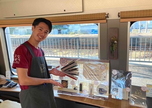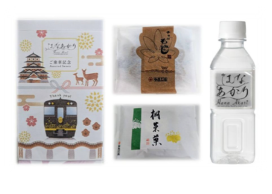 アテンダント3名が乗車し、2号車サロンにて地域ならではのお土産品や飲料、「はなあかり」グッズ等を販売します。