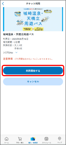 チケット詳細画面からチケットを選んで[チケットを使う]をタップ -
