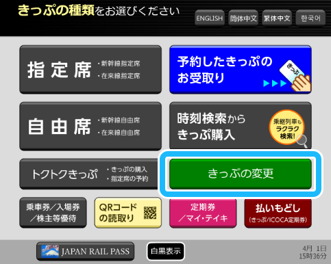- 01 「きっぷの変更」を押してください。