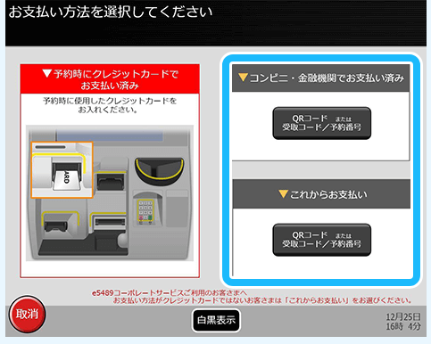 予約番号(5桁)またはQRコード、電話番号(全桁)