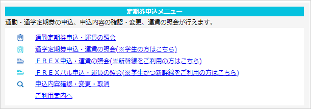 定期券の確認・変更・取消をご希望の場合、以下の「定期券申込メニュー」から「申込内容確認・変更・取消」を選択してください。
