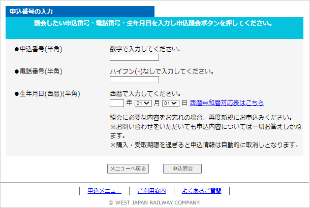 申込時に発行された申込番号(6桁)、および登録した電話番号と生年月日を入力し、[申込照会]を押します。