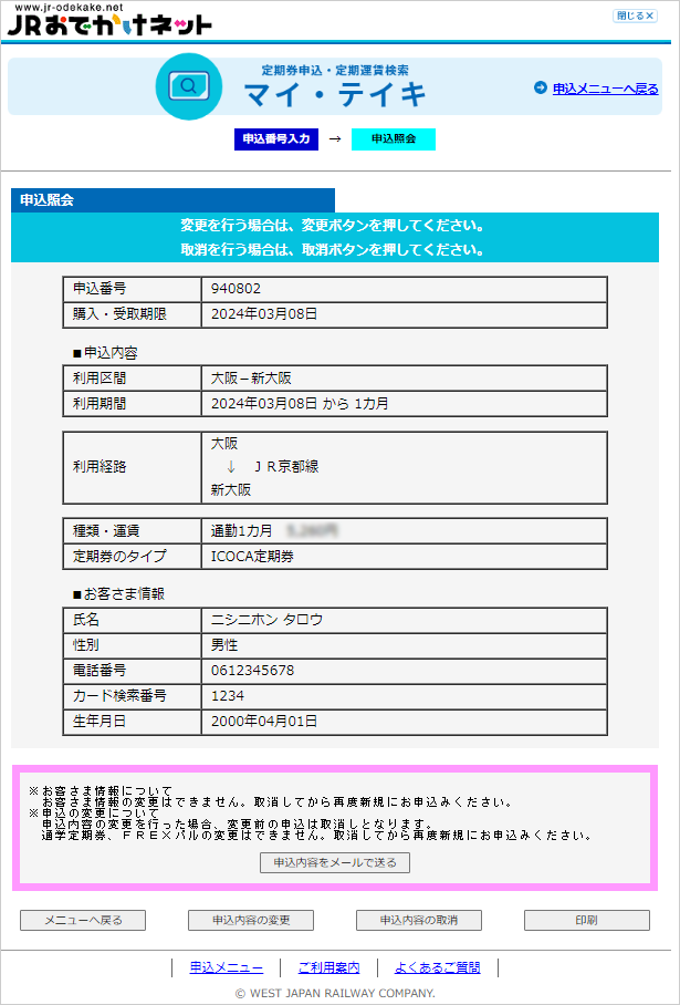 「定期券申込メニュー」画面から申込内容の確認を行い、[申込内容の変更]を押します。