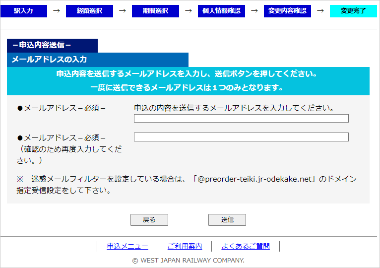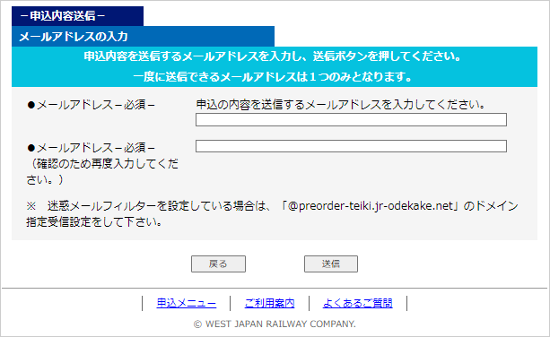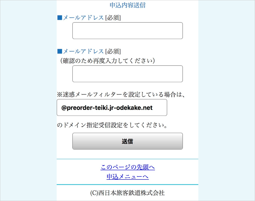 - 迷惑メールフィルターを設定している場合、「@preorder-teiki.jr-odekake.net」のドメイン指定受信設定をしてください。