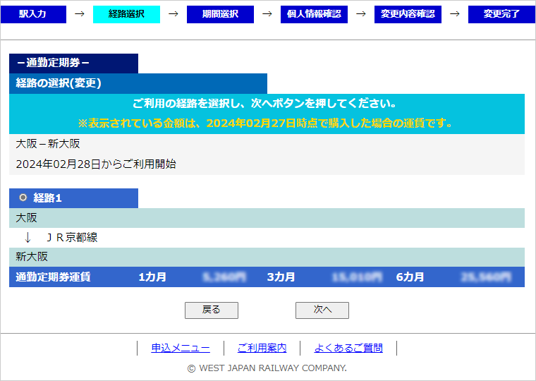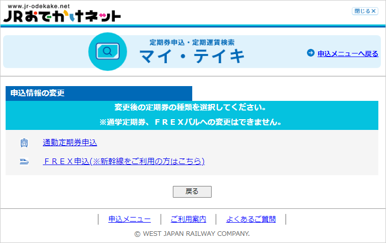 変更後の定期券の種類を、[通勤定期券申込]または[通勤用新幹線定期券(FREX)申込]からお選びください。