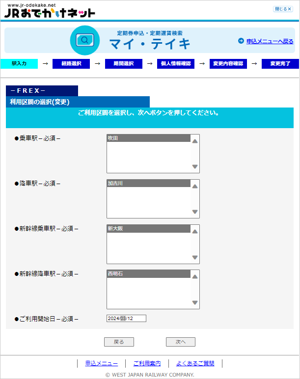 - 「通勤用新幹線定期券(FREX)」の場合は、新幹線乗車駅と新幹線降車駅も入力してください。