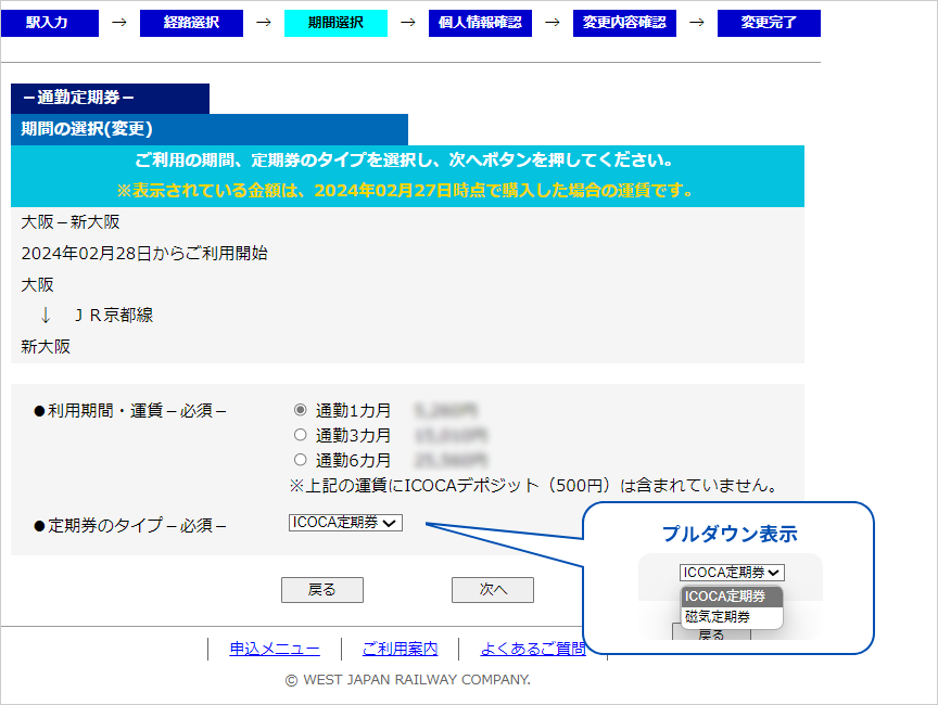定期券の利用期間(1カ月/3カ月/6カ月)と定期券のタイプ(ICOCA定期券/磁気定期券)を選択してください。