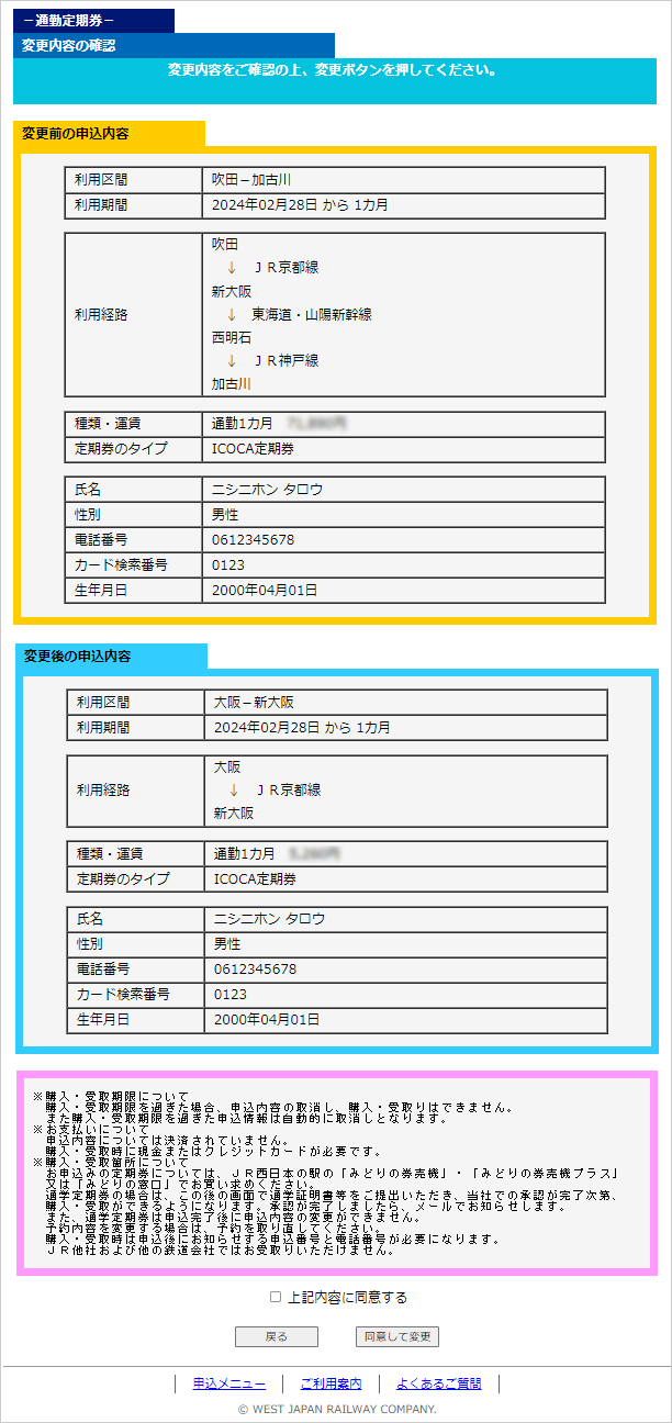 変更内容、購入・受取方法に関するご案内をご確認いただき、ご同意いただける場合は「上記内容に同意する」をチェックの上、[同意して変更]を押してください。