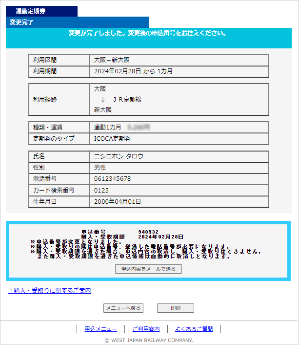 変更が完了し、新たなQRコードと申込番号(6桁)購入・受取期限が表示されます。