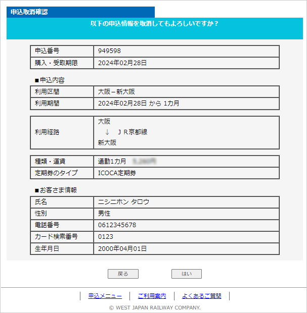 お申込みを取消する定期券の情報をご確認のうえ、[はい]を押します。