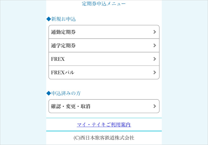 「定期券申込メニュー」画面で、「通勤定期券申込」「通学定期券申込」「FREX申込」「FREXパル申込」をお選びください。