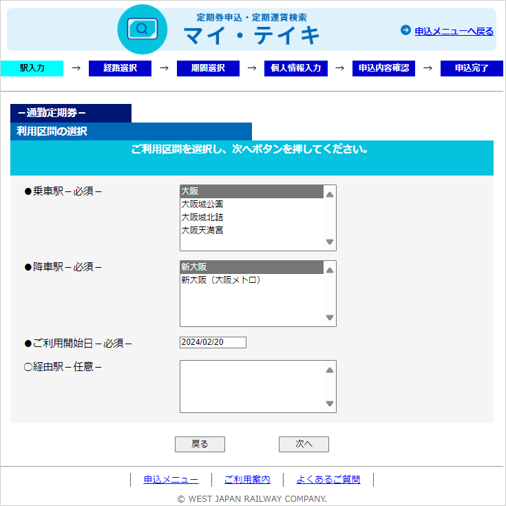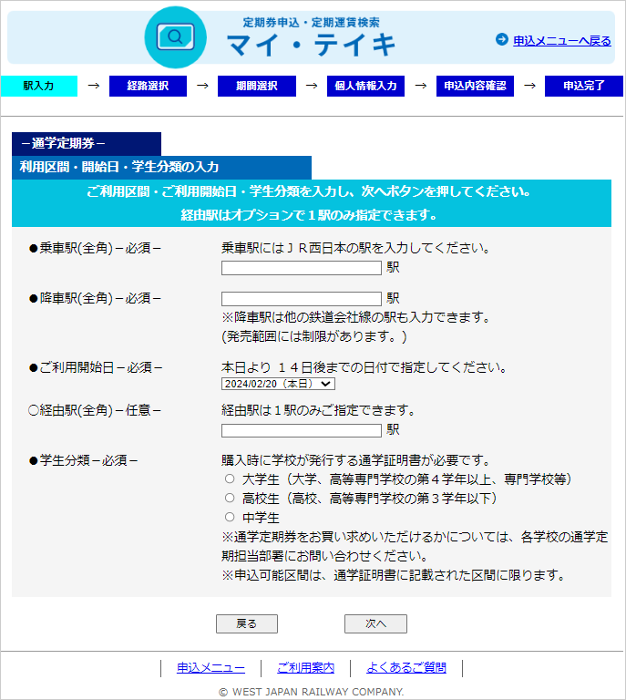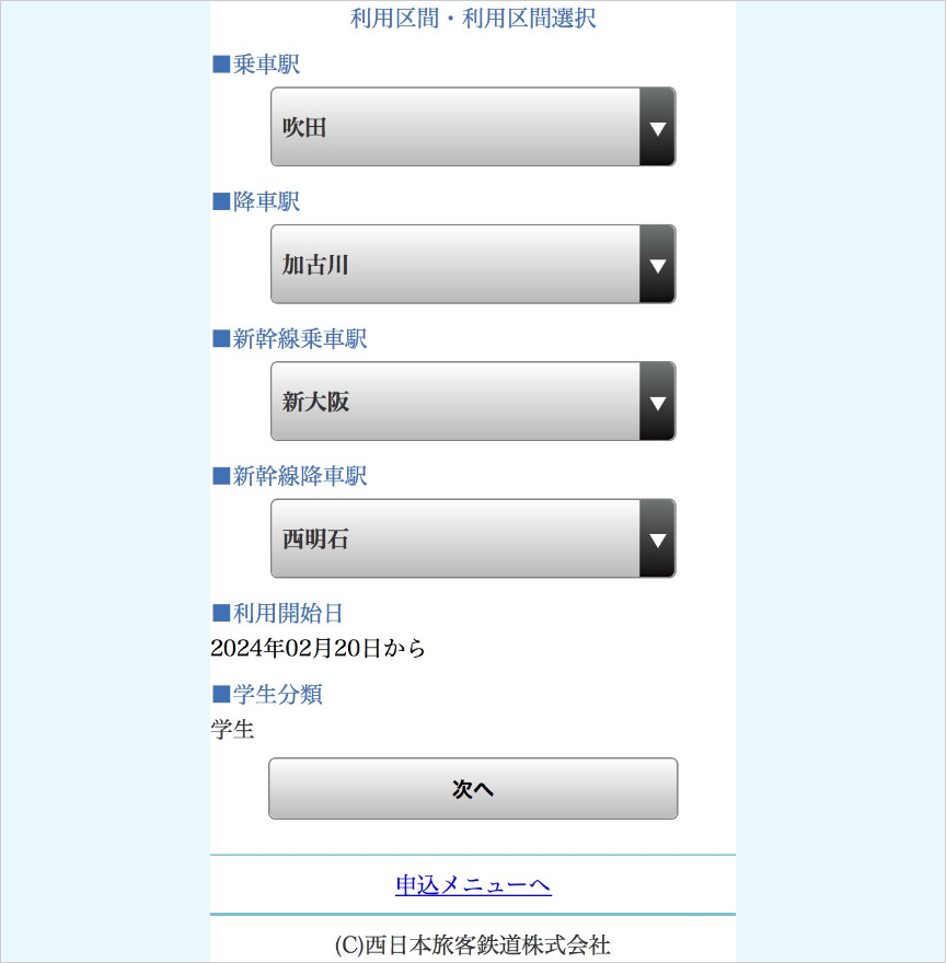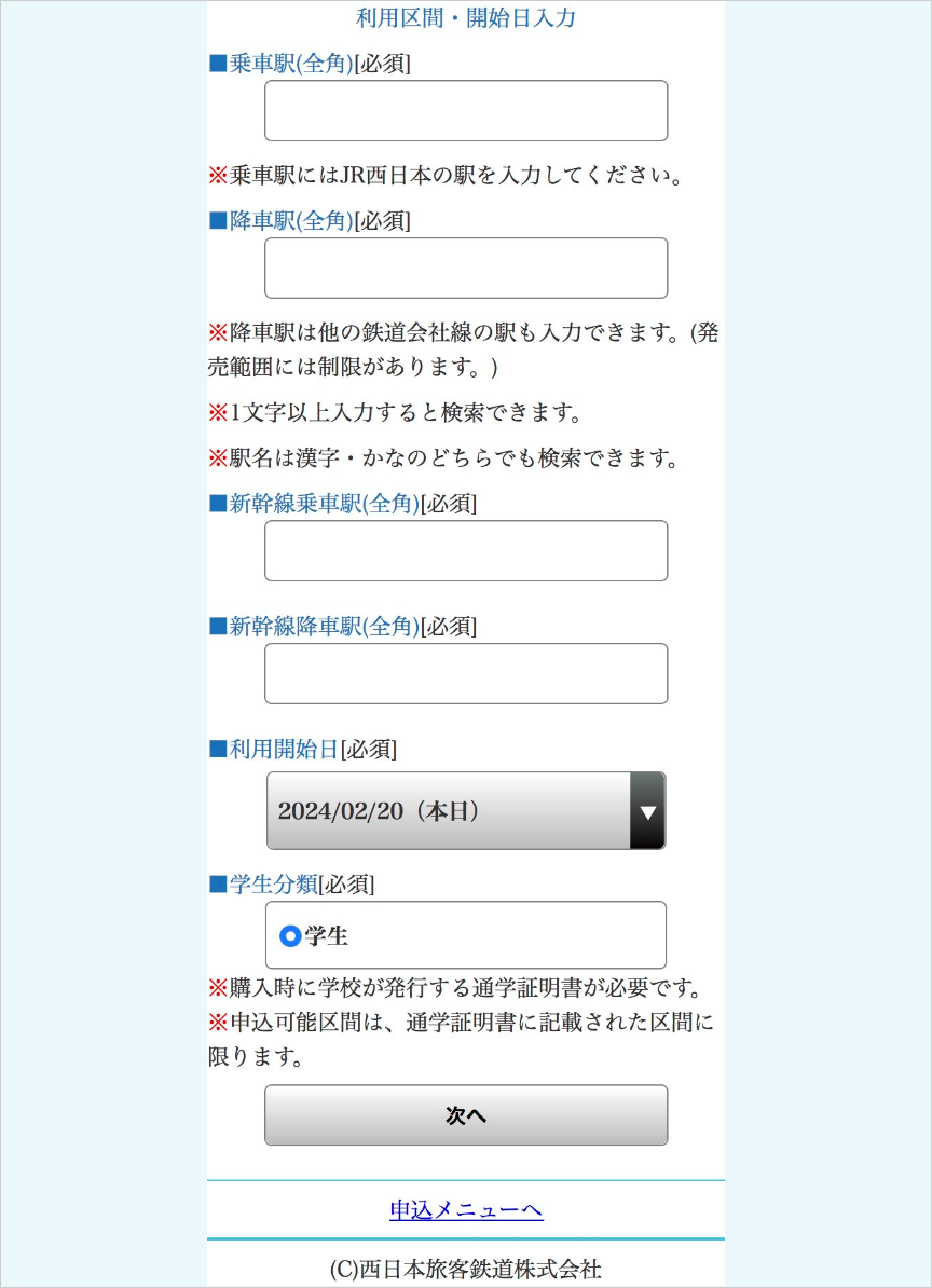 また、申込できる区間は、「通学証明書」または「通学定期券購入兼用証明書」に記載された区間に限ります。 - ご利用開始日は、本日より14日後までの日付が指定できます。