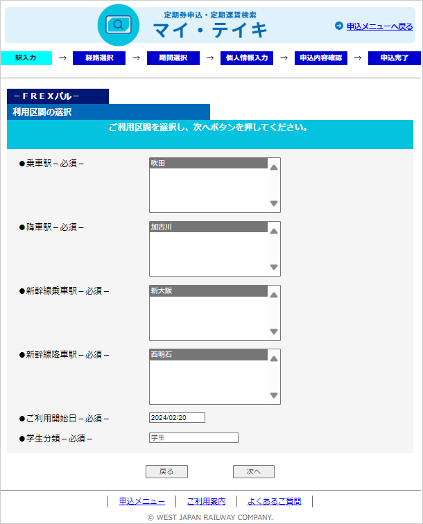 通学定期券を申込の場合、「学生分類」を選択してください(FREXパルの学生分類は「学生」のみ)。- パソコン画面(通学)