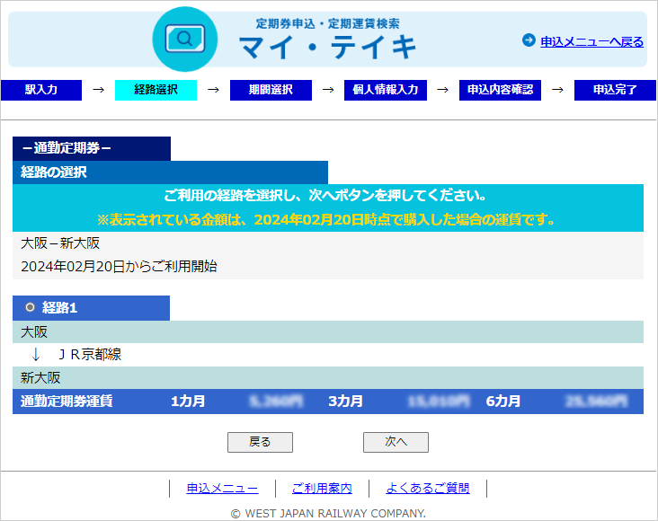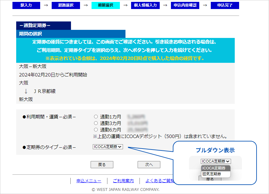 定期券運賃の確認、利用期間と定期券のタイプの選択