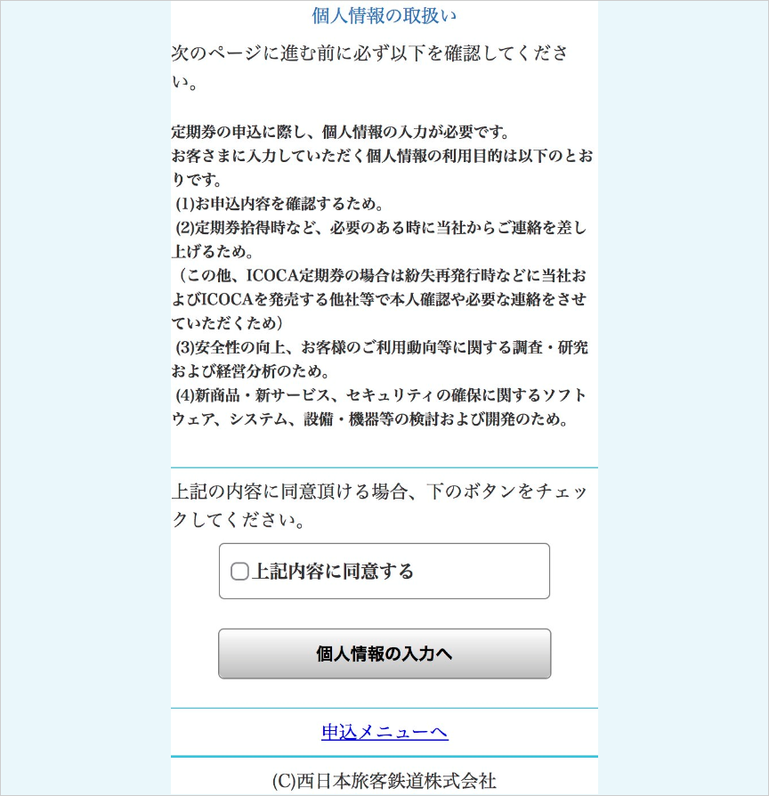 個人情報のお取扱いに関する内容をご確認の上、ご同意いただける場合、「上記内容に同意する」をチェックし、「同意する」を押してください(スマホの場合、「個人情報入力へ」を選択してください)。