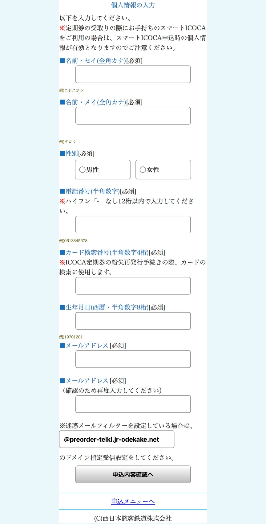 通学定期・FREXパルの場合、申込内容を送信するメールアドレスを入力してください。なお、迷惑メールフィルターを設定している場合、「@preorder-teiki.jr-odekake.net」のドメイン指定受信設定をしてください。- パソコン画面(通学)