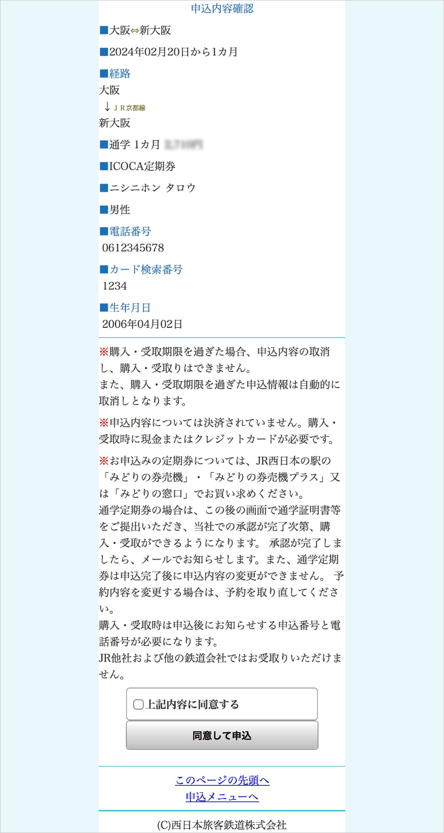 申込内容、購入・受取方法に関するご案内をご確認いただき、ご同意いただける場合は「上記内容に同意する」をチェックの上、[同意して申込]を押してください。