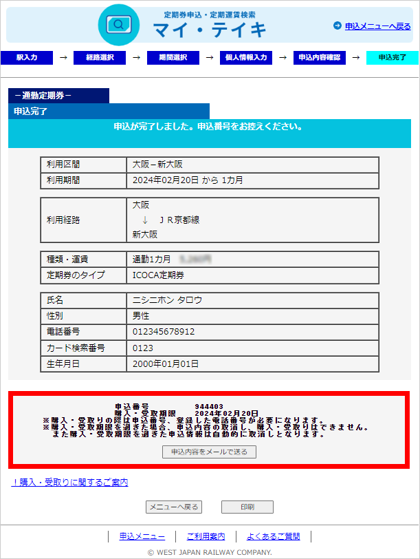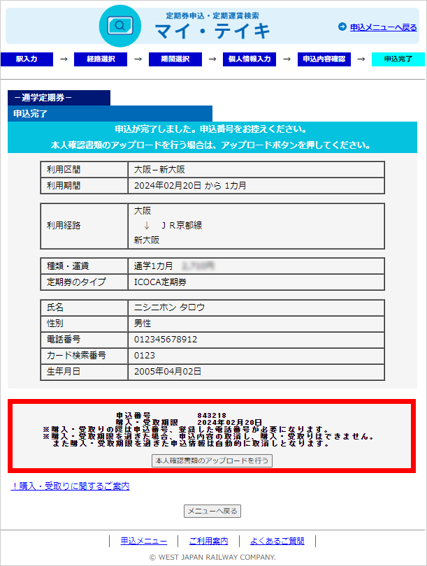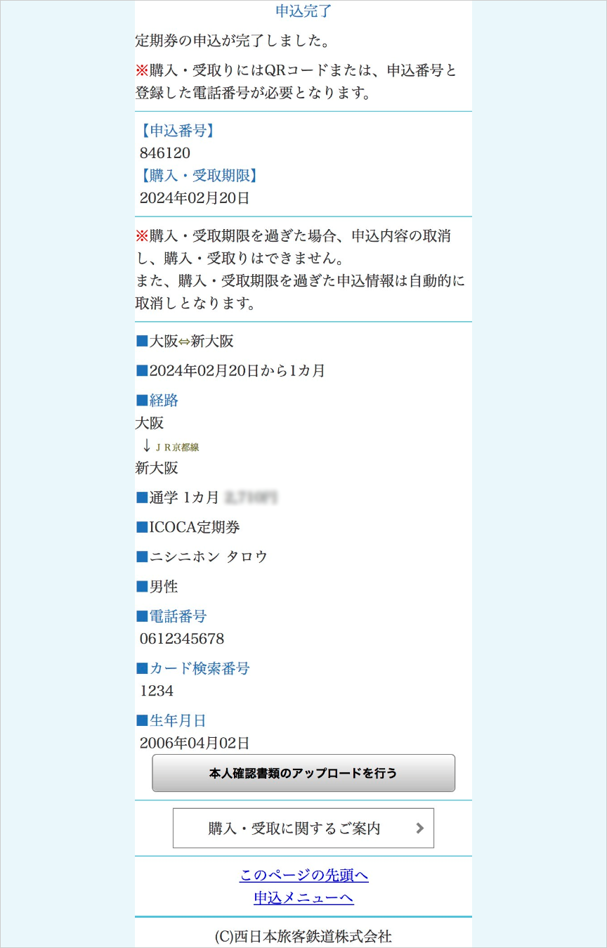 申込完了(通学定期券・FREXパル定期券のお受け取りは本人確認書類のアップロードが必要)