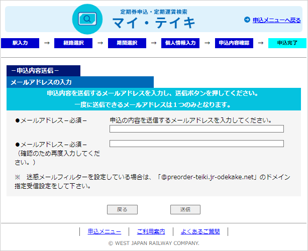 メールアドレスをご入力いただき、[送信]ボタンを押下してください。- 迷惑メールフィルターを設定している場合、「@preorder-teiki.jr-odekake.net」のドメイン指定受信設定をしてください。