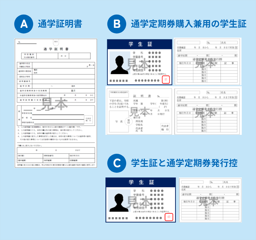 - 通学証明書は在籍する学校の代表者が必要事項を記入し、学校代表者職印を押印したもので、証明書の有効期間・通学期間が明記されていること。