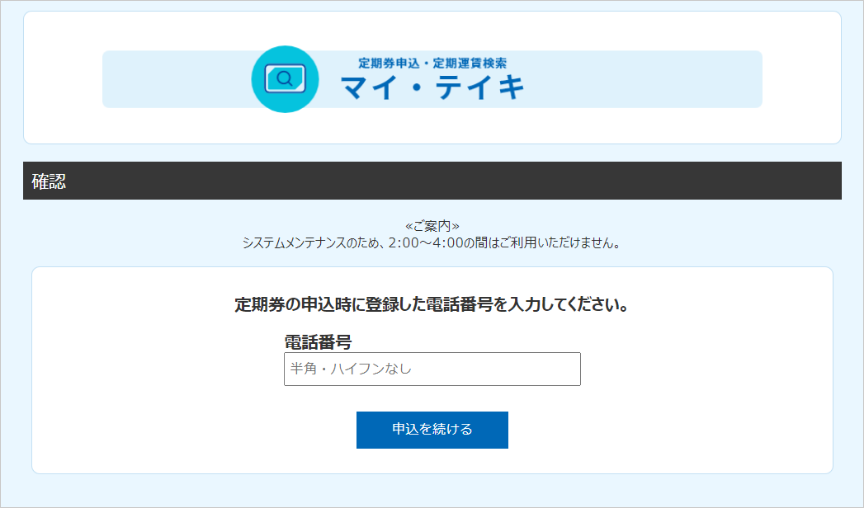 (1)申込時に入力した電話番号を入力し、「申込を続ける」ボタンを押してください。