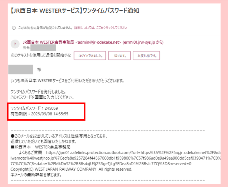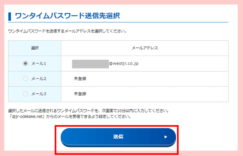 選択したメールアドレス宛に、ワンタイムパスワードが通知されますので、メール本文中のワンタイムパスワードをご確認下さい。