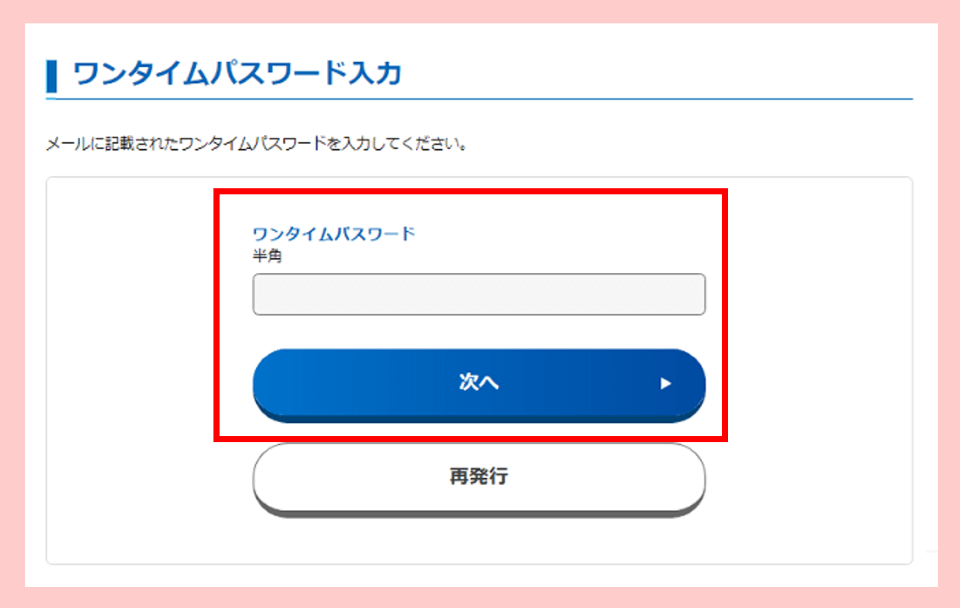 ※前回のログインより期間が経過していない場合は、ワンタイムパスワードの入力画面は表示されません。表示されない場合はログインが完了しているため、STEP2へお進みください。