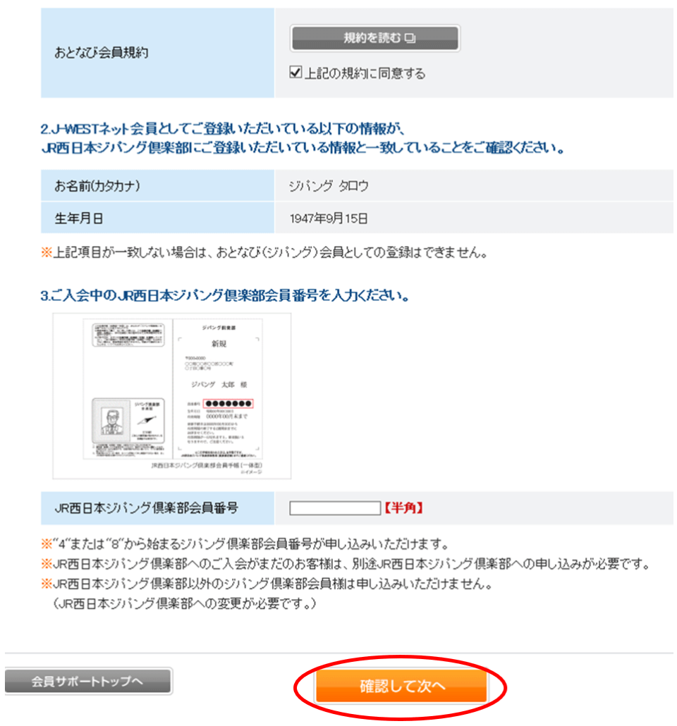 規約に同意いただいた方のみ「JR西日本ジパング倶楽部会員番号」を入力する欄が表示されます。