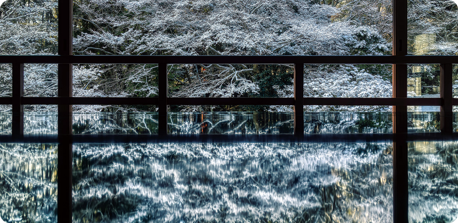 約3,300㎡の広さを誇る庭園は国の名勝に指定。四季折々の花を目当てに多くの観光客が訪れます。最近では、主屋に置かれた座卓に映り込んだ庭を写すリフレクション撮影がSNSを通じて人気を集めています。