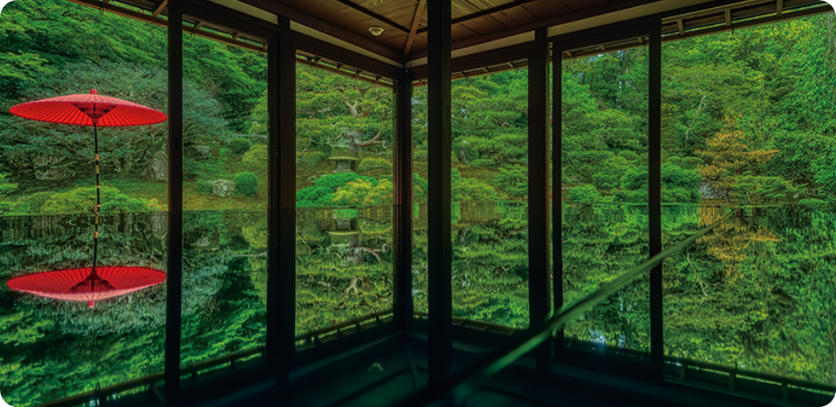 約3,300m²の広さを誇る庭園は国の名勝に指定。四季折々の花を目当てに多くの観光客が訪れます。最近では、主屋に置かれた座卓に映り込んだ庭を写すリフレクション撮影がSNSを通じて人気を集めています。
