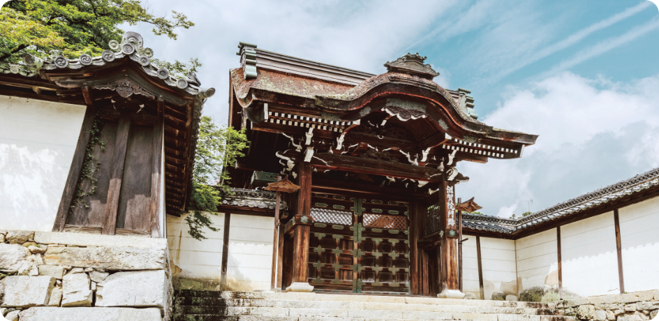 天海大僧正が1615年に京都・北白川の法勝寺を移転したものと伝わります。広大な敷地には穴太衆積みの石垣と白壁の門のほかに、江戸時代初期の小堀遠州の作庭とされる国指定名勝庭園や狩野派の障壁画を鑑賞することができます。