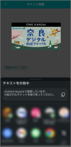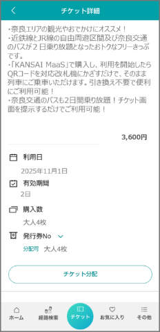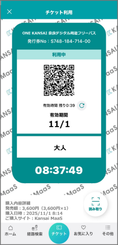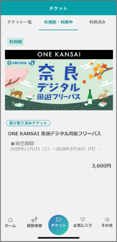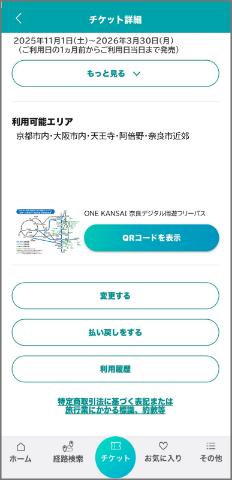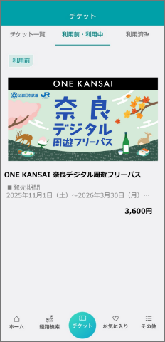 必要な運賃をお支払いのうえ利用ください。なお、チケット画面が表示できない期間に別途お支払いになった運賃は払いもどしいたしません。 - 正規販売以外(オークションや転売行為を含む)で購入された「ONE KANSAI奈良デジタル周遊フリーパス」に伴うトラブルは一切責任を負いません。